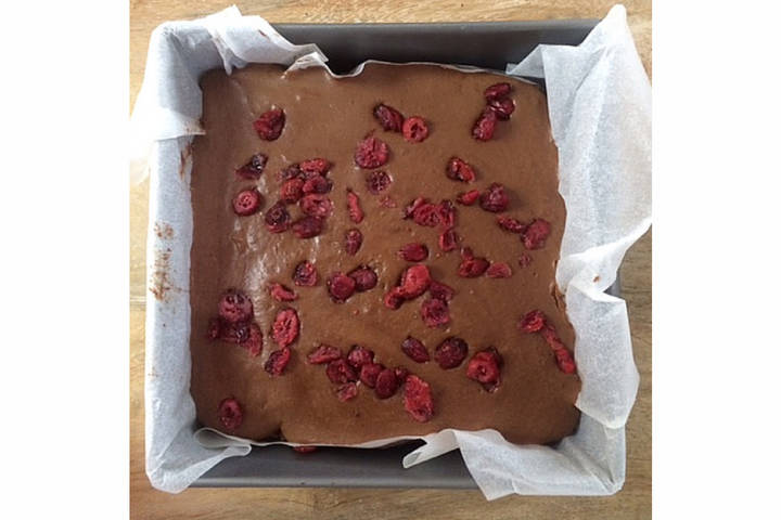 Drain dates but keep some of the date water to use if mixture is too dry. Blend all of base ingredients together except cranberries. Add cranberries and fold through. Pour mixture into baking tin lined with baking paper. Place in freezer and freeze for 1 hour.
